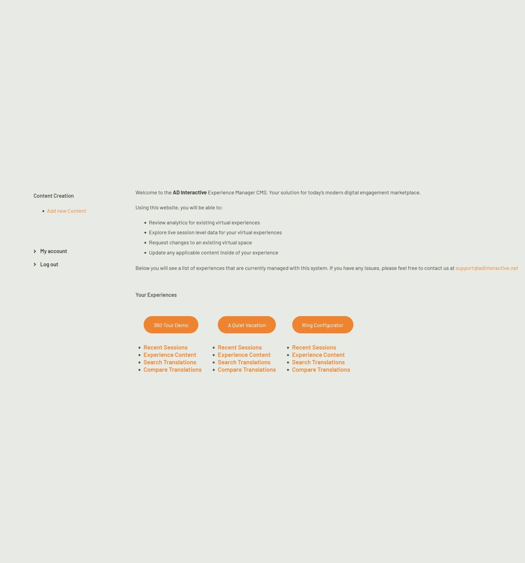 AD Interactive’s Experience manager serves as the core platform for providing content to individual digital experiences. From text, images, and videos, to custom files, links, and subtitles, the elements of your your experiences are in your control. Using the Experience Manager, our clients avoid needing to return to a developer to make content changes and have access to provide easy translation and localization options for a global project reach.